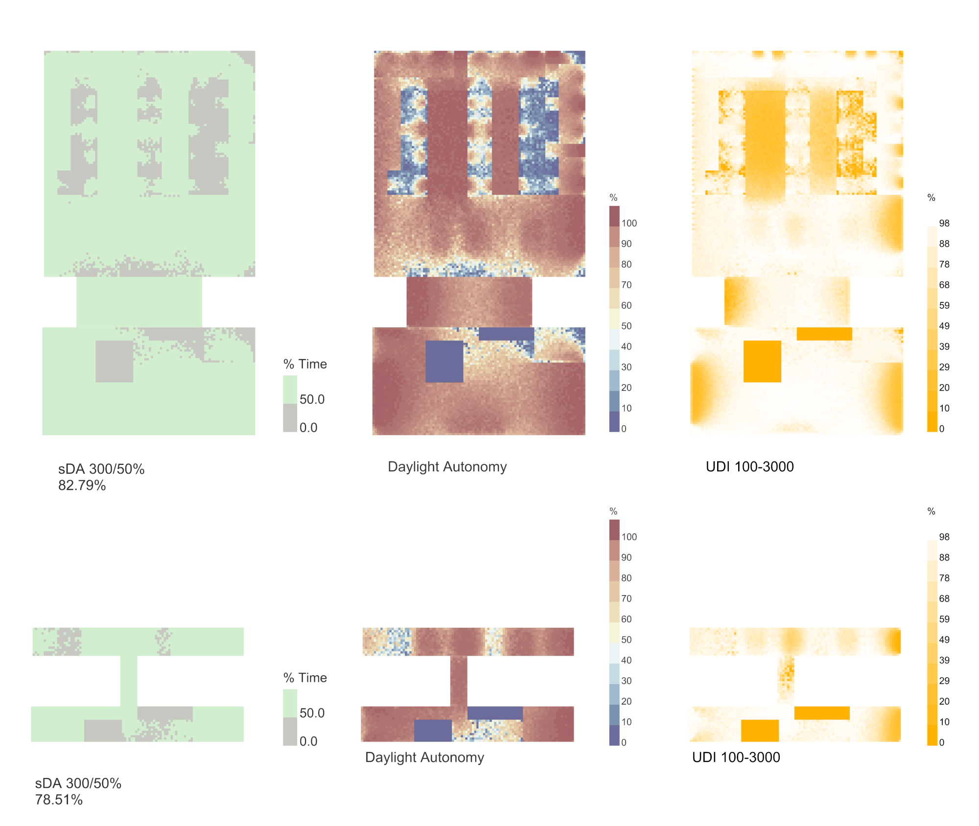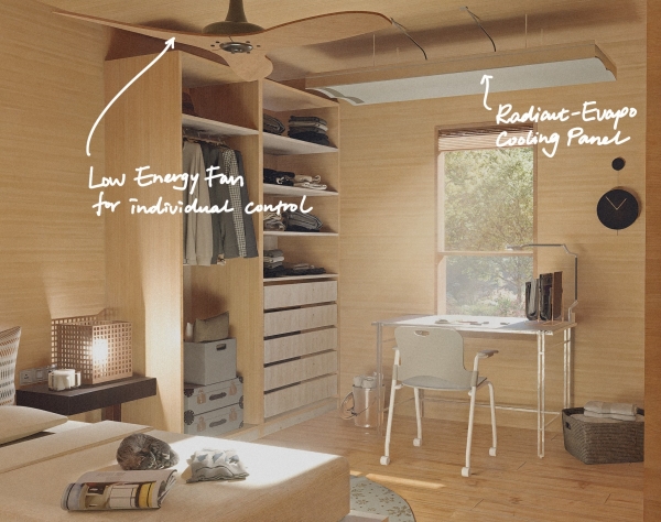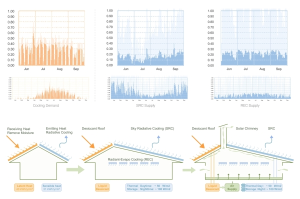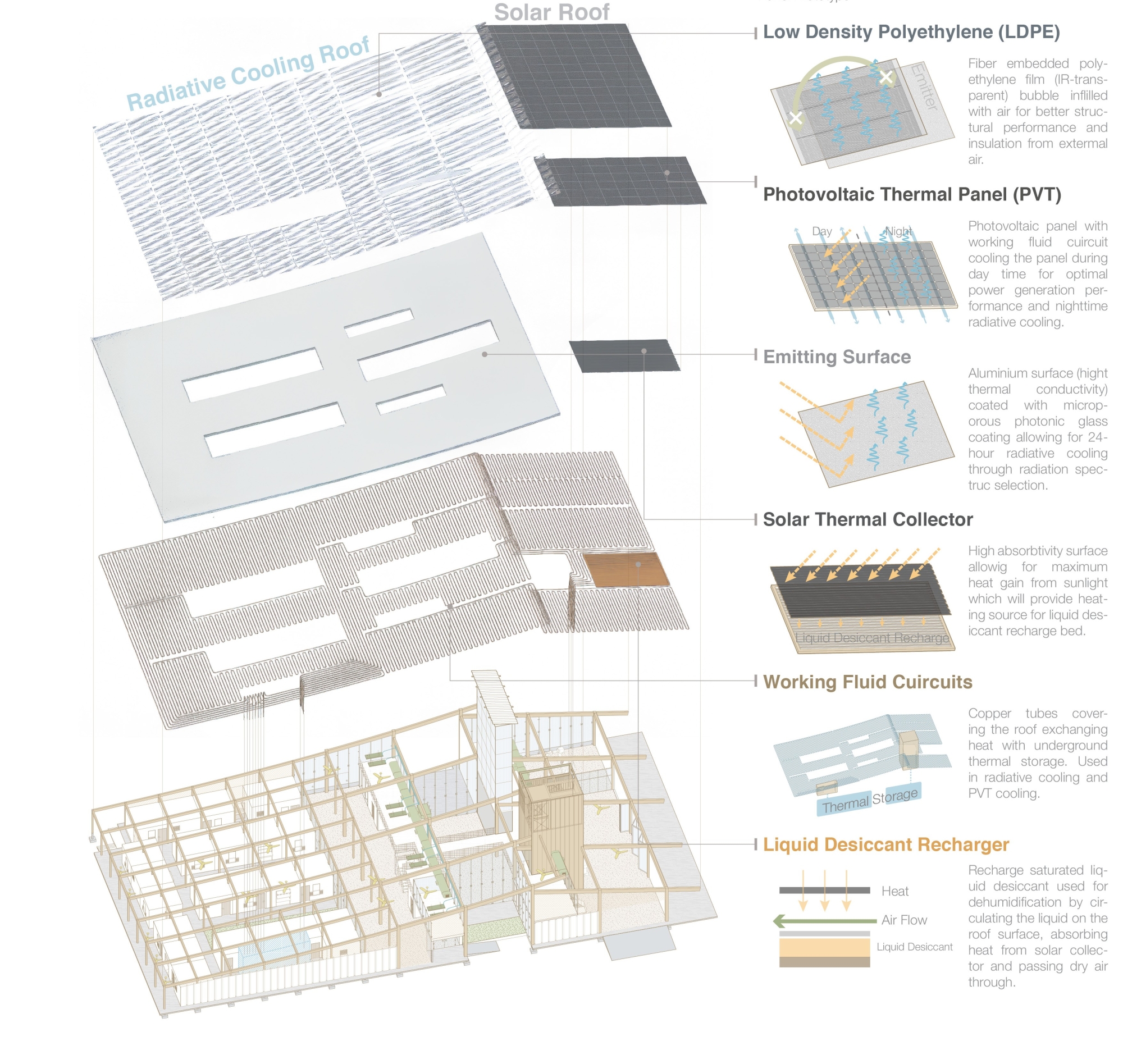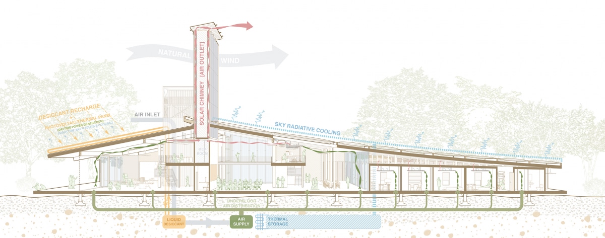 At the heart of its climate-responsive strategy is a hybrid conditioning system. Radiative cooling is harnessed via an IR-transparent membrane-protected north roof surface, allowing heat to escape to the sky while preventing condensation in Texas’s humid climate. A liquid desiccant loop, recharged by solar heat from the south roof where integrated PV panels generate on-site renewable energy, dehumidifies incoming air. Each roof is sized and calibrated precisely to the building’s cooling and dehumidification needs, supplemented with an Evapo-Radiant Panel that captures the undepleted evaporative cooling potential of exhaust air. Together, these systems form a finely tuned architecture of performance.